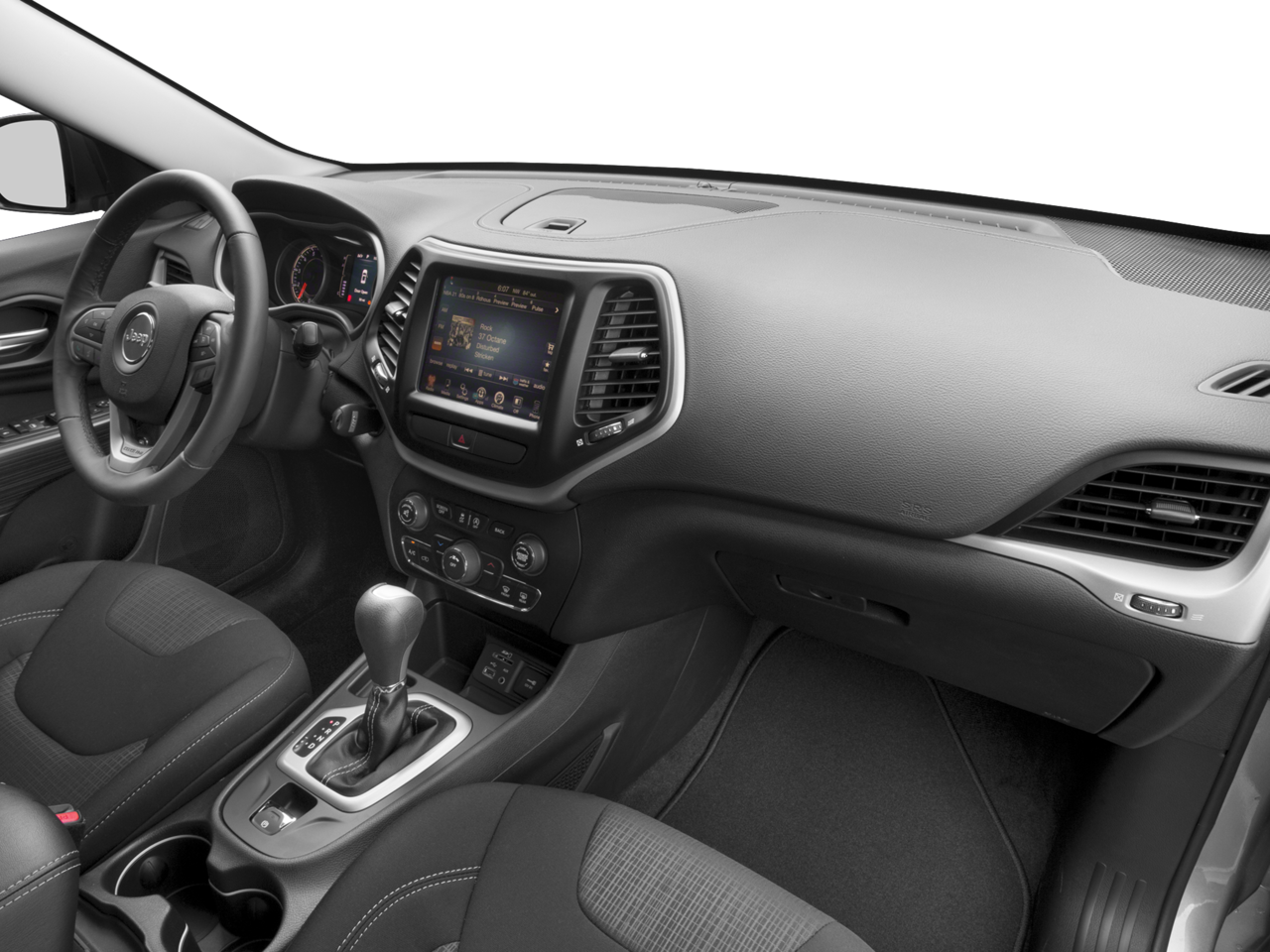 This Cherokee Latitude is nicely equipped with Quick Order Package 24J, 17 x 7 Aluminum Wheels, 3.73 Axle Ratio, 4-Wheel Disc Brakes, 6 Speakers, 600 Amp Maintenance Free Battery, ABS brakes, Active Grille Shutters, Air Conditioning, Alloy wheels, AM/FM radio, Anti-whiplash front head restraints, Auxiliary Transmission Oil Cooler, Brake assist, Bumpers: body-color, Compass, Delay-off headlights, Driver door bin, Driver vanity mirror, Dual front impact airbags, Dual front side impact airbags, Electronic Stability Control, Engine Oil Cooler, Four wheel independent suspension, Front anti-roll bar, Front Bucket Seats, Front Center Armrest, Front fog lights, Front reading lights, Fully automatic headlights, High intensity discharge headlights: Bi-Xenon, Illuminated entry, Integrated Voice Command w/Bluetooth®, Knee airbag, Low tire pressure warning, Normal Duty Suspension, Occupant sensing airbag, Outside temperature display, Overhead airbag, Overhead console, Panic alarm, ParkView Rear Back-Up Camera, Passenger door bin, Passenger vanity mirror, Power door mirrors, Power steering, Power windows, Premium Cloth Bucket Seats, Radio data system, Radio: Uconnect 3 w/5 Display, Rear anti-roll bar, Rear reading lights, Rear seat center armrest, Rear side impact airbag, Rear window defroster, Rear window wiper, Remote keyless entry, Roof rack: rails only, Speed control, Speed-sensing steering, Split folding rear seat, Spoiler, Steering wheel mounted audio controls, Tachometer, Telescoping steering wheel, Tilt steering wheel, Traction control, Trip computer, Variably intermittent wipers, and Voltmeter.
