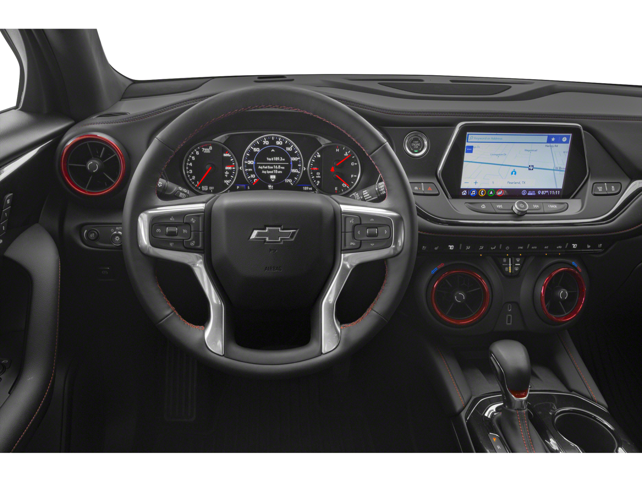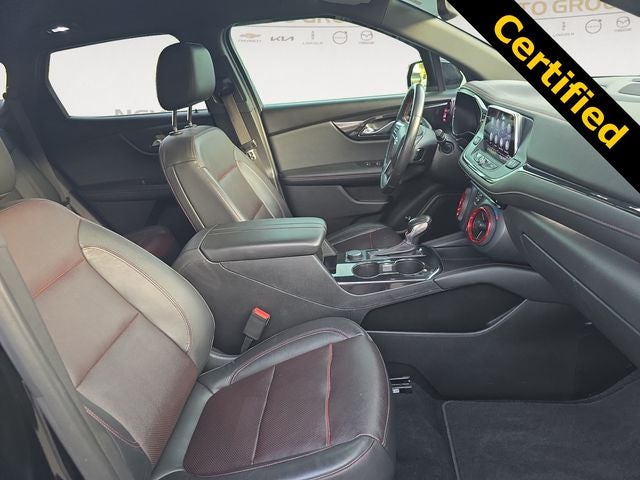 This Blazer RS is nicely equipped with Preferred Equipment Group 1RS, 155 Amp Alternator, 3.49 Final Drive Axle Ratio, 4-Wheel Disc Brakes, 6 Speakers, 6-Speaker Audio System Feature, 6-Way Power Front Passenger Seat Adjuster, ABS brakes, Air Conditioning, Alloy wheels, AM/FM radio: SiriusXM, Apple CarPlay/Android Auto, Auto-dimming door mirrors, Auto-dimming Rear-View mirror, Automatic temperature control, Brake assist, Bumpers: body-color, Cargo Management System, Child-Seat-Sensing Airbag, Compass, Delay-off headlights, Driver door bin, Driver vanity mirror, Dual front impact airbags, Dual front side impact airbags, Electronic Stability Control, Emergency communication system: OnStar and Chevrolet connected services capable, Exterior Parking Camera Rear, Four wheel independent suspension, Front anti-roll bar, Front Bucket Seats, Front Center Armrest, Front dual zone A/C, Front reading lights, Fully automatic headlights, Garage door transmitter, Heated door mirrors, Heated Driver & Front Passenger Seats, Heated front seats, Heated steering wheel, High-Intensity Discharge Headlights, Illuminated entry, Knee airbag, Leather Shift Knob, Low tire pressure warning, Navigation System, Occupant sensing airbag, Outside temperature display, Overhead airbag, Overhead console, Panic alarm, Passenger door bin, Passenger vanity mirror, Perforated Leather-Appointed Seat Trim, Power door mirrors, Power driver seat, Power Liftgate, Power passenger seat, Power steering, Power windows, Radio data system, Radio: Chevrolet Infotainment 3 Plus System, Rear anti-roll bar, Rear reading lights, Rear seat center armrest, Rear window defroster, Rear window wiper, Remote keyless entry, Ride & Handling Suspension, Security system, SiriusXM w/360L, Speed control, Speed-sensing steering, Split folding rear seat, Spoiler, Steering wheel mounted audio controls, Tachometer, Telescoping steering wheel, Tilt steering wheel, Traction control, Trip computer, Turn signal indicator mirrors, Variably intermittent wipers, Voltmeter, and Wheels: 20 Dark Android Machined-Face Aluminum.