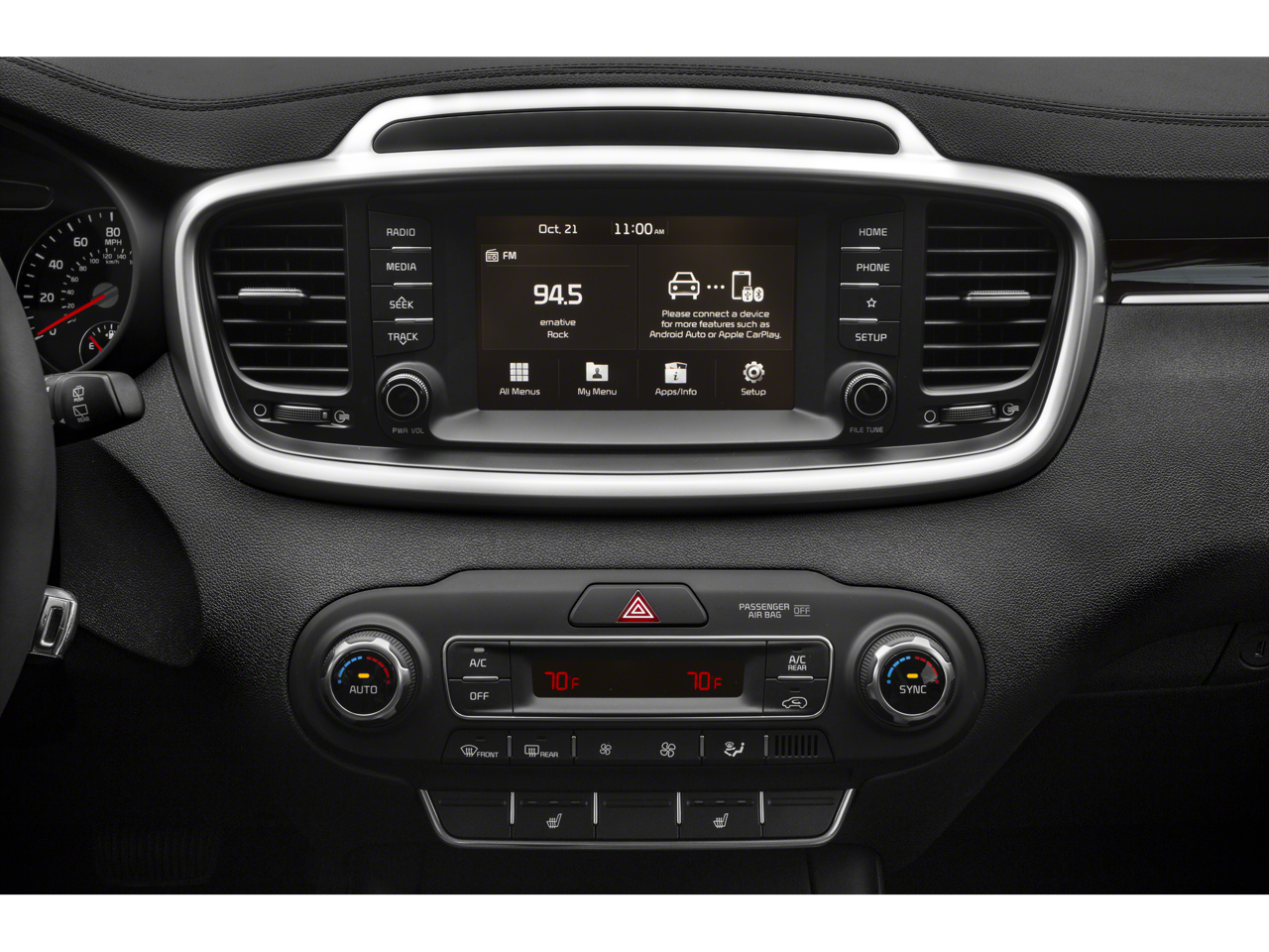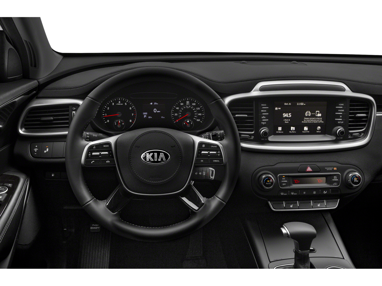 This Sorento LX is nicely equipped with 17 x 7.0 Alloy Wheels, 3.648 Axle Ratio, 3rd row seats: split-bench, 4-Wheel Disc Brakes, 6 Speakers, ABS brakes, Air Conditioning, Alloy wheels, AM/FM radio, Apple CarPlay & Android Auto, Brake assist, Bumpers: body-color, Carpeted Floor Mats (7-Passenger), Delay-off headlights, Driver door bin, Driver vanity mirror, Dual front impact airbags, Dual front side impact airbags, Electronic Stability Control, Exterior Parking Camera Rear, Four wheel independent suspension, Front anti-roll bar, Front Bucket Seats, Front Center Armrest, Front reading lights, Fully automatic headlights, Heated door mirrors, Illuminated entry, Low tire pressure warning, Occupant sensing airbag, Outside temperature display, Overhead airbag, Overhead console, Panic alarm, Passenger door bin, Passenger vanity mirror, Power door mirrors, Power steering, Power windows, Radio data system, Radio: AM/FM/MP3 Audio System, Rear anti-roll bar, Rear seat center armrest, Rear window defroster, Rear window wiper, Remote keyless entry, Security system, Speed control, Speed-sensing steering, Split folding rear seat, Spoiler, Steering wheel mounted audio controls, Tachometer, Telescoping steering wheel, Tilt steering wheel, Traction control, Trip computer, Turn signal indicator mirrors, Variably intermittent wipers, and YES Essentials Cloth Seat Trim.