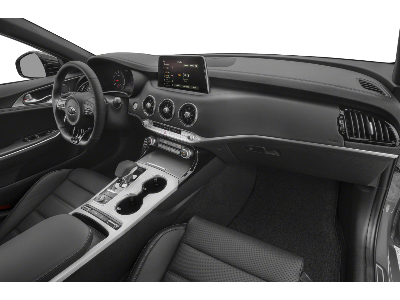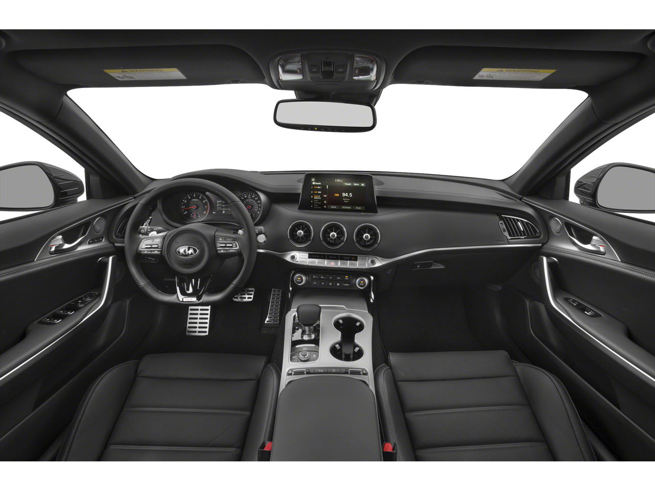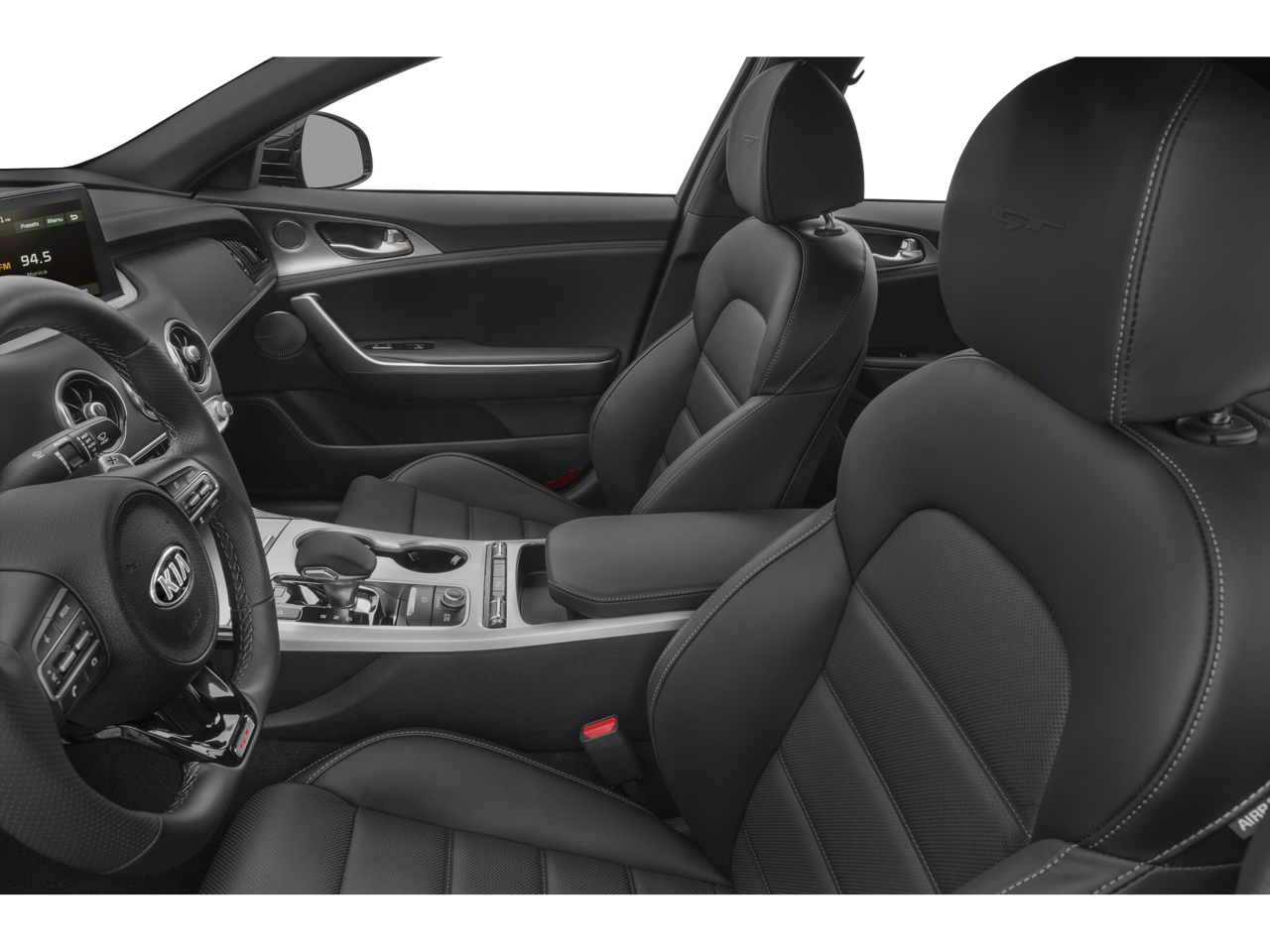 This Stinger GT is nicely equipped with 4-Wheel Disc Brakes, 9 Speakers, ABS brakes, Air Conditioning, Alloy wheels, AM/FM radio: SiriusXM, Anti-whiplash front head restraints, Apple CarPlay & Android Auto, Auto-dimming Rear-View mirror, Automatic temperature control, Brake assist, Bumpers: body-color, Carpeted Floor Mat, Delay-off headlights, Driver door bin, Driver vanity mirror, Dual front impact airbags, Dual front side impact airbags, Electronic Stability Control, Emergency communication system: UVO eServices, Exterior Parking Camera Rear, Four wheel independent suspension, Front anti-roll bar, Front Bucket Seats, Front Center Armrest, Front dual zone A/C, Front reading lights, Fully automatic headlights, Heated door mirrors, Heated Front Bucket Seats, Heated front seats, Illuminated entry, Knee airbag, Leather Seat Trim, Low tire pressure warning, Occupant sensing airbag, Outside temperature display, Overhead airbag, Overhead console, Panic alarm, Passenger door bin, Passenger vanity mirror, Power door mirrors, Power driver seat, Power passenger seat, Power steering, Power windows, Radio: AM/FM/MP3/HD/SiriusXM Audio System, Rear air conditioning, Rear anti-roll bar, Rear reading lights, Rear seat center armrest, Rear window defroster, Remote keyless entry, Security system, Speed control, Speed-sensing steering, Speed-Sensitive Wipers, Split folding rear seat, Sport steering wheel, Steering wheel mounted audio controls, Tachometer, Telescoping steering wheel, Tilt steering wheel, Traction control, Trip computer, Turn signal indicator mirrors, Variably intermittent wipers, and Wheels: 8.0J x 19 Front/8.5J x 19 Rear Alloy.