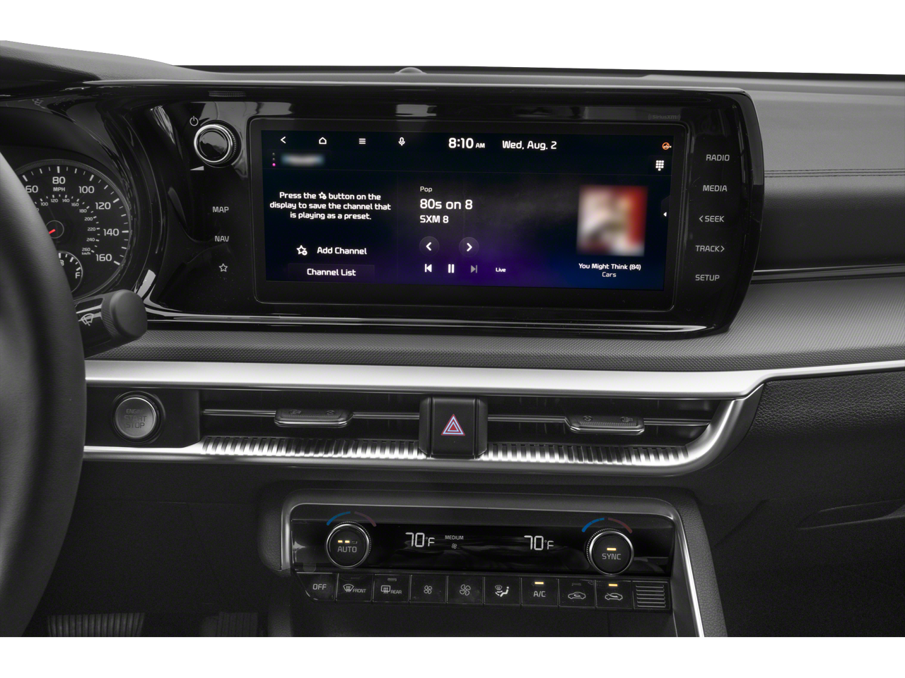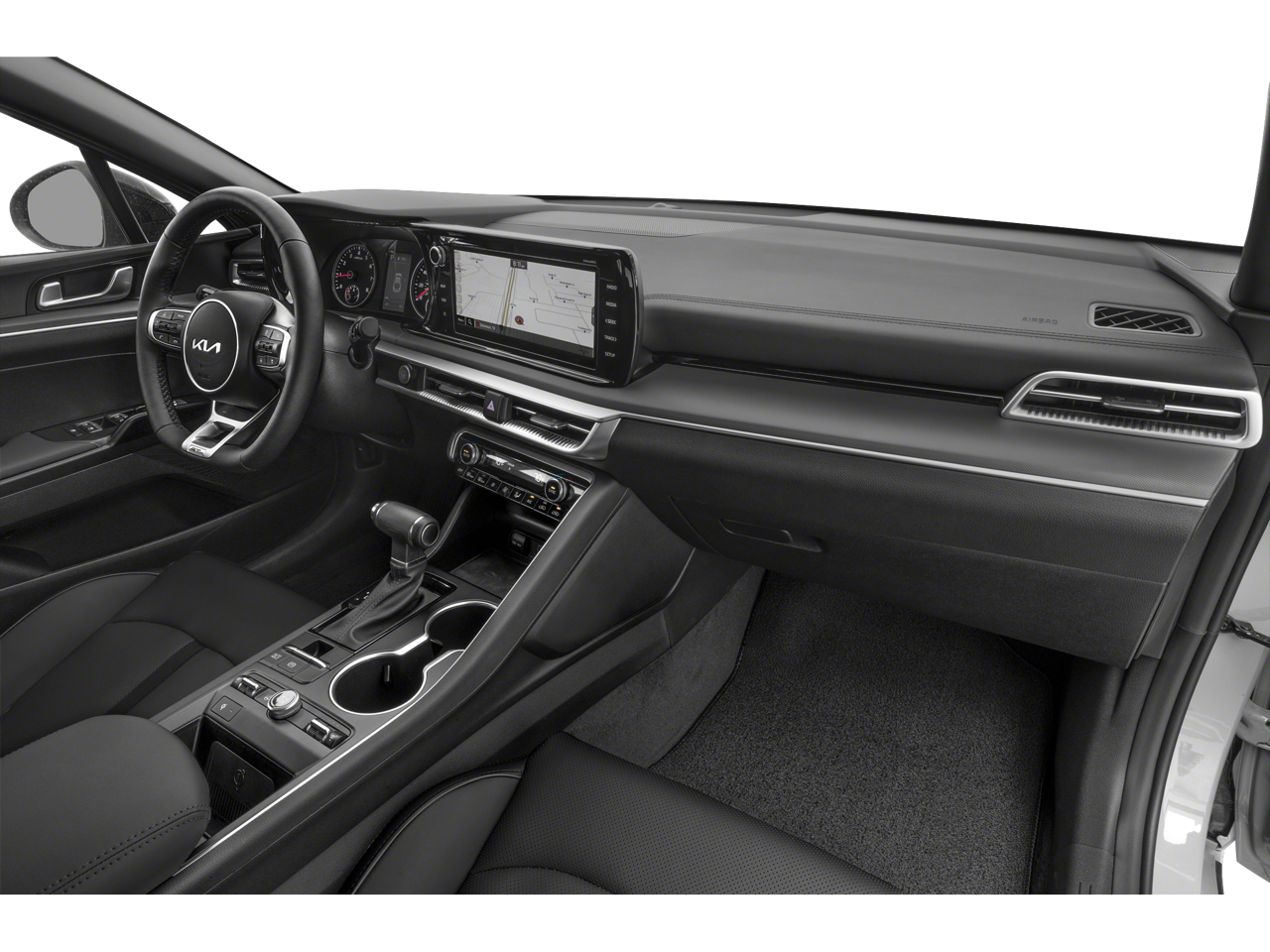 This K5 GT-Line is nicely equipped with 4-Wheel Disc Brakes, 6 Speakers, ABS brakes, Air Conditioning, Alloy wheels, AM/FM radio: SiriusXM, Apple CarPlay & Android Auto, Auto High-beam Headlights, Automatic temperature control, Brake assist, Bumpers: body-color, Cargo Tray, Carpeted Floor Mats, Cloth/SynTex Seat Trim, Delay-off headlights, Driver door bin, Driver vanity mirror, Dual front impact airbags, Dual front side impact airbags, Electronic Stability Control, Four wheel independent suspension, Front anti-roll bar, Front Bucket Seats, Front Center Armrest, Front dual zone A/C, Front fog lights, Front reading lights, Fully automatic headlights, Heated door mirrors, Illuminated entry, Knee airbag, Low tire pressure warning, Navigation System, Occupant sensing airbag, Outside temperature display, Overhead airbag, Overhead console, Panic alarm, Passenger door bin, Passenger vanity mirror, Power door mirrors, Power driver seat, Power steering, Power windows, Radio data system, Radio: AM/FM/MP3 Audio System, Rear anti-roll bar, Rear seat center armrest, Rear side impact airbag, Rear window defroster, Remote keyless entry, Security system, Speed control, Speed-sensing steering, Split folding rear seat, Spoiler, Sport steering wheel, Steering wheel mounted audio controls, Tachometer, Telescoping steering wheel, Tilt steering wheel, Traction control, Trip computer, Turn signal indicator mirrors, Variably intermittent wipers, and Wheels: 18 Gloss Black Machined Finish Alloy.